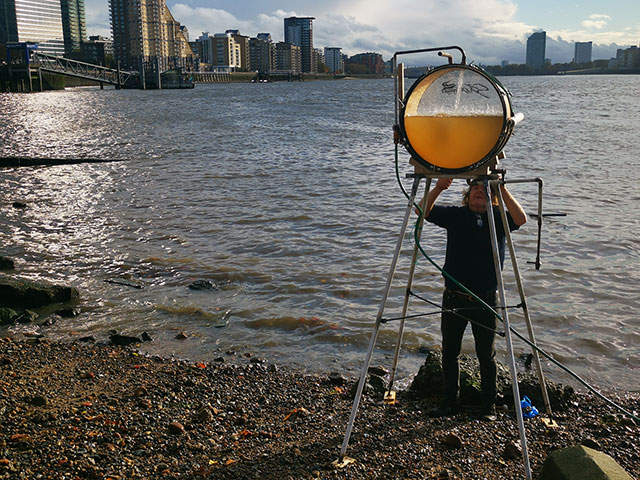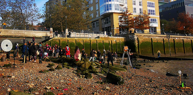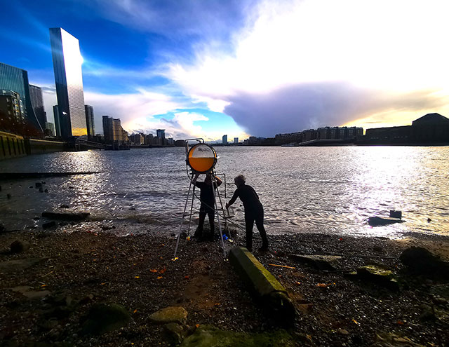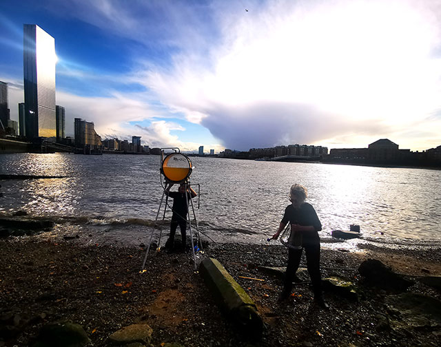 Richard’s Wilson’s bass drum was filled with river water with a hose coming from a pump in the river. As the bass drum filled, Richard played throughout on both the empty and full part of the bass which changed from a vibrant, resonant tone when it was empty, through to a dull thud when it was full. Anne Bean then opened the tap from the drum to fill up an aquaphone with the river water, an instrument which also responds to amount of water in the metal chamber as it is bowed or beaten. Mark Anderson and Ansuman Biswas joined in to form a trio of aquaphones filled with river water from the bass, accompanying the brightening sound of the emptying drum.