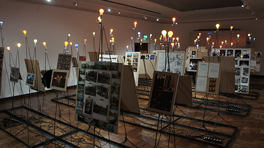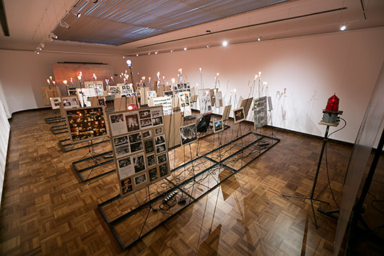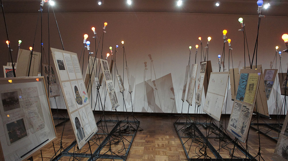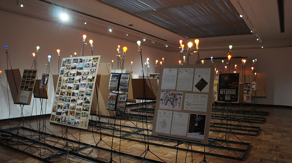 At the loud heart of Great Noises that Fill the Air was a radical take on archival display. Drawn from sketches, photographs and ephemera from Bow Gamelan Ensemble’s archive and placed on music stands, this interactive installation acted as a ‘symbolic score’ heralding new ways of perceiving and creating sound. Underscoring the tumultuous din of their experimental collaborations were The Thundersheet. This newly commissioned kinetic sound sculpture and collaborative acoustic instrument was activated live by Anne Bean and Richard Wilson at the opening ceremony of the exhibition filling Cooper Gallery with a vast spectrum of sound rippling on the cusp of meaning.