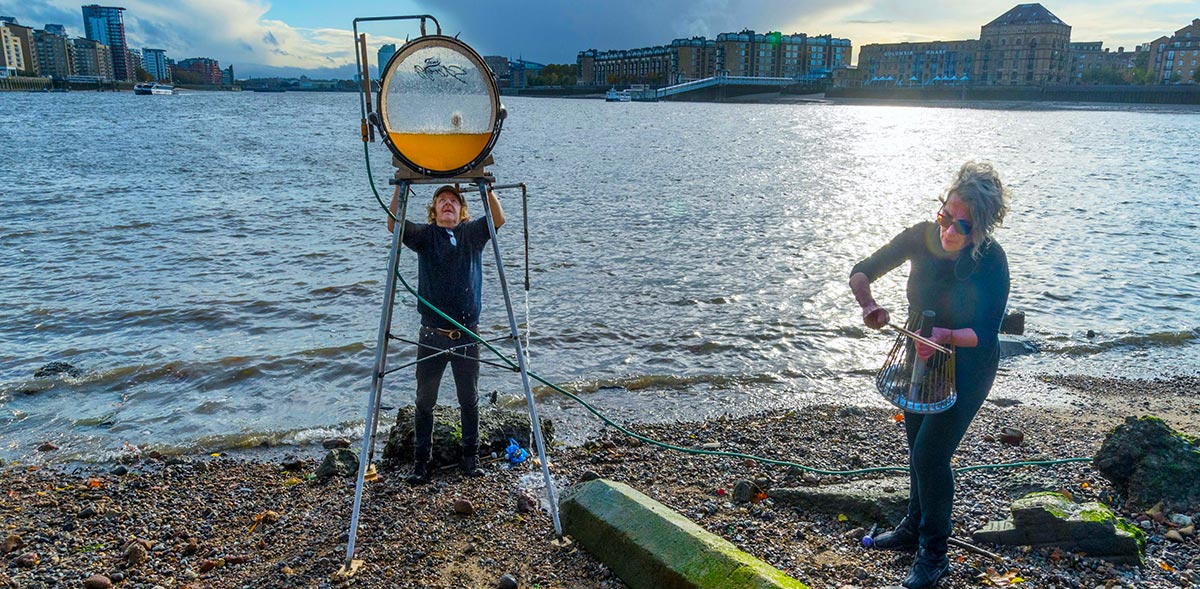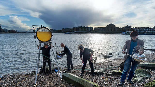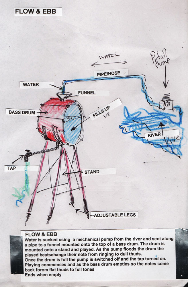 Richard’s Wilson’s bass drum was filled with river water with a hose coming from a pump in the river. As the bass drum filled, Richard played throughout on both the empty and full part of the bass which changed from a vibrant, resonant tone when it was empty, through to a dull thud when it was full. Anne Bean then opened the tap from the drum to fill up an aquaphone with the river water, an instrument which also responds to amount of water in the metal chamber as it is bowed or beaten. Mark Anderson and Ansuman Biswas joined in to form a trio of aquaphones filled with river water from the bass, accompanying the brightening sound of the emptying drum.