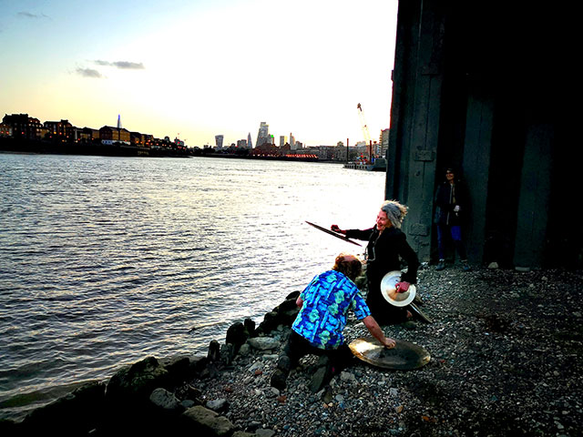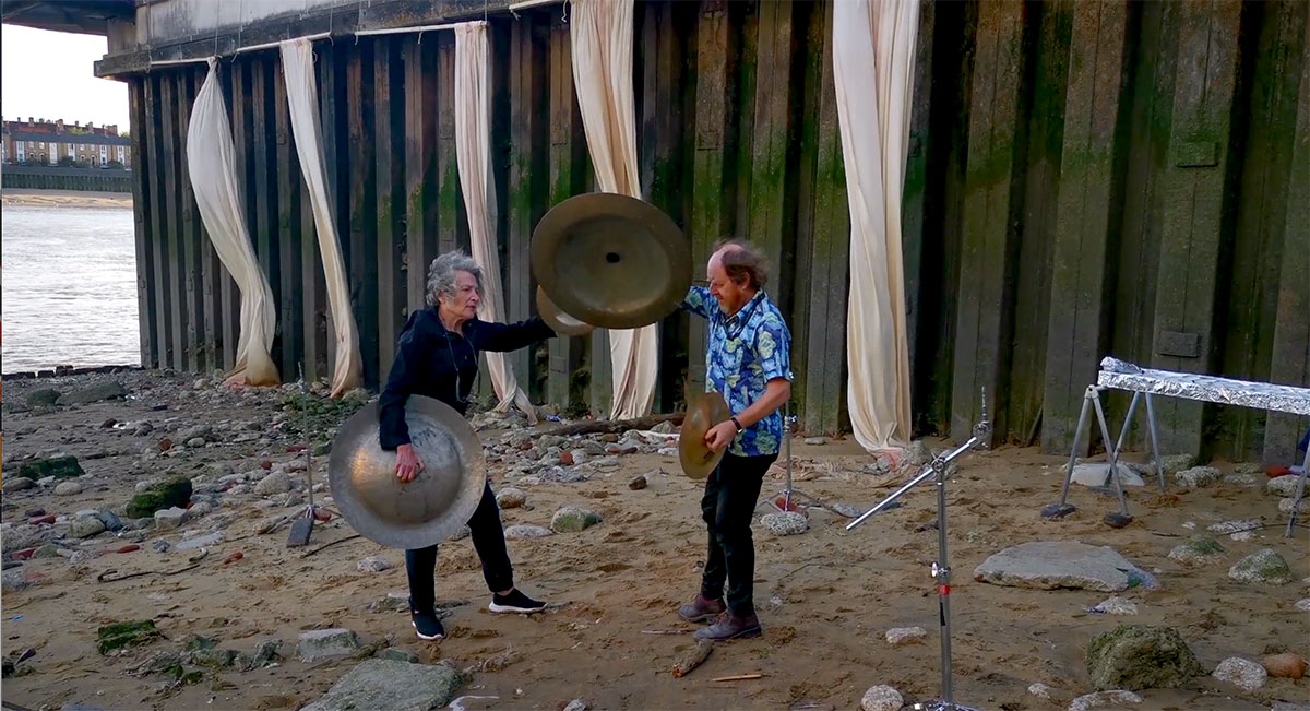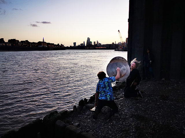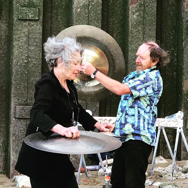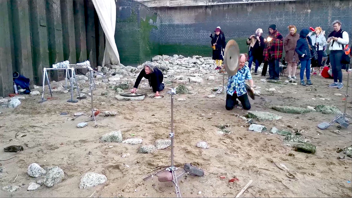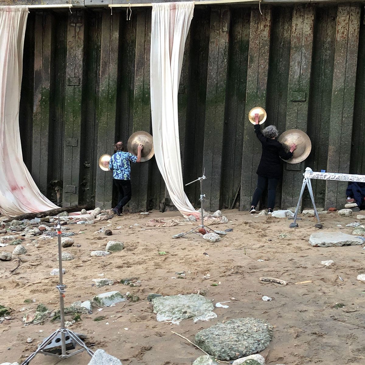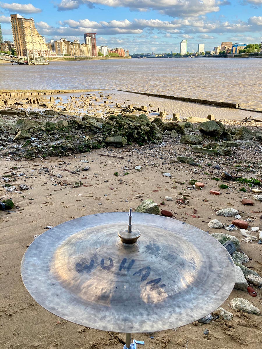 Wuhan has been a familiar word to us for many years because of the city’s hand-made gongs and cymbals, which we often used in events, referring to them as Wuhans. They appeared in several of our scores as the word WUHAN in amongst breath and sirens, thunder drums and skulls, hooters and cannons, dark and welder, frogs and thunder sheets, fire extinguisher and strobes, harmonica balloons and goat bells. On July 5th at the exact moment of each of the full Thunder moon, the Dark moon, the sunset and the low tide, Wuhans will be gonged and we’ll toast each of these sun and moon actions and interactions.