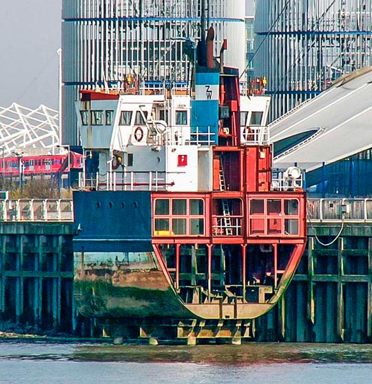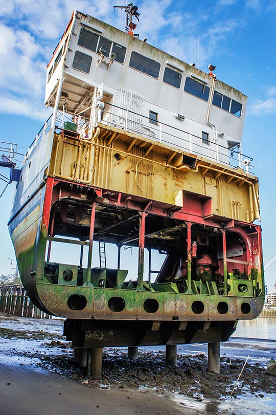 Standing on the foreshore of the Thames, the work comprises of a sliced vertical section of an ocean going sand dredger. The original ship was reduced in length by 85%, leaving a vertical portion housing the ships habitable sections: bridge, poop, accommodation and engine room. The slicing of the vessel opened the structure, leaving it exposed to the effects of weather and tide.