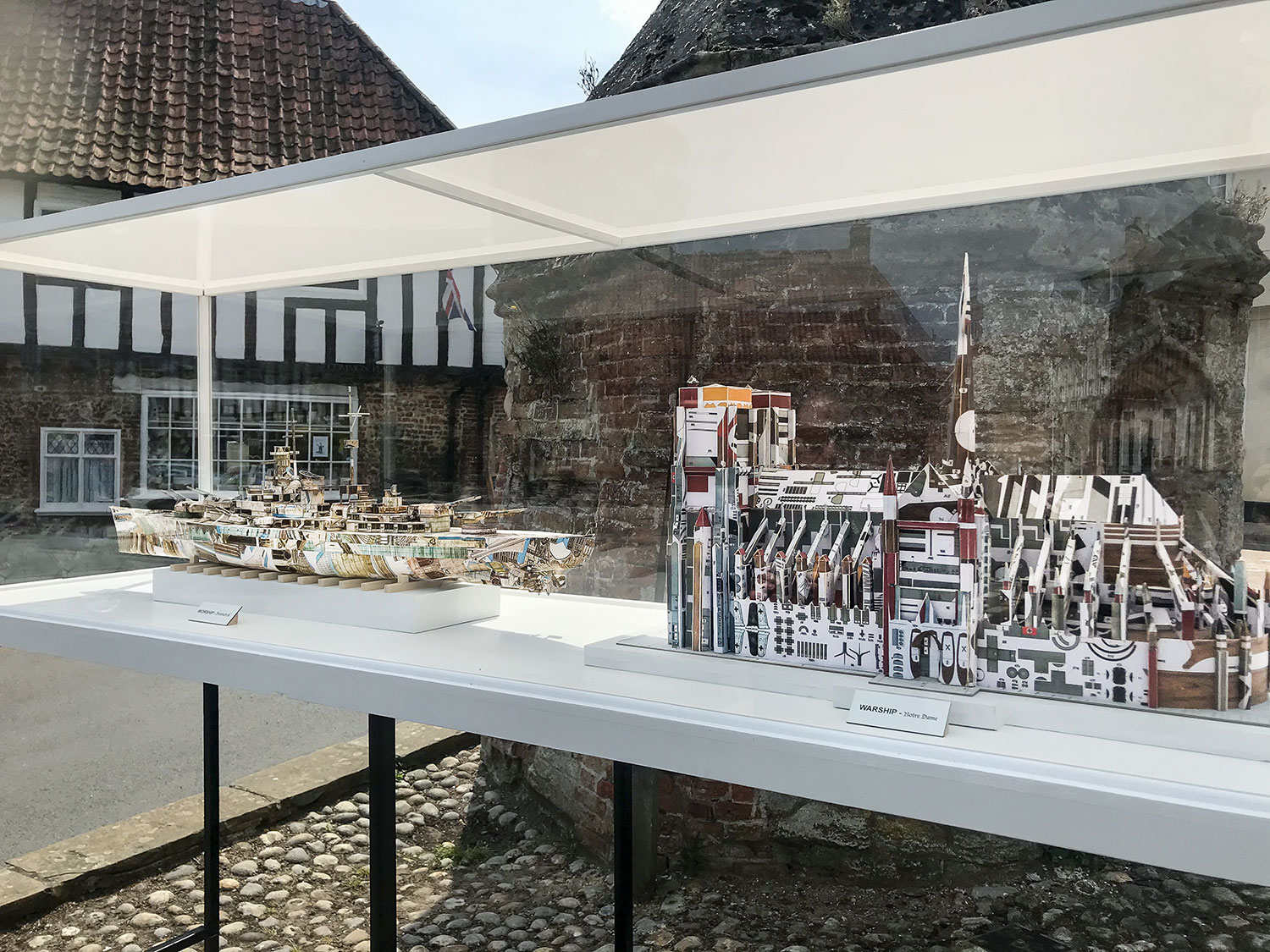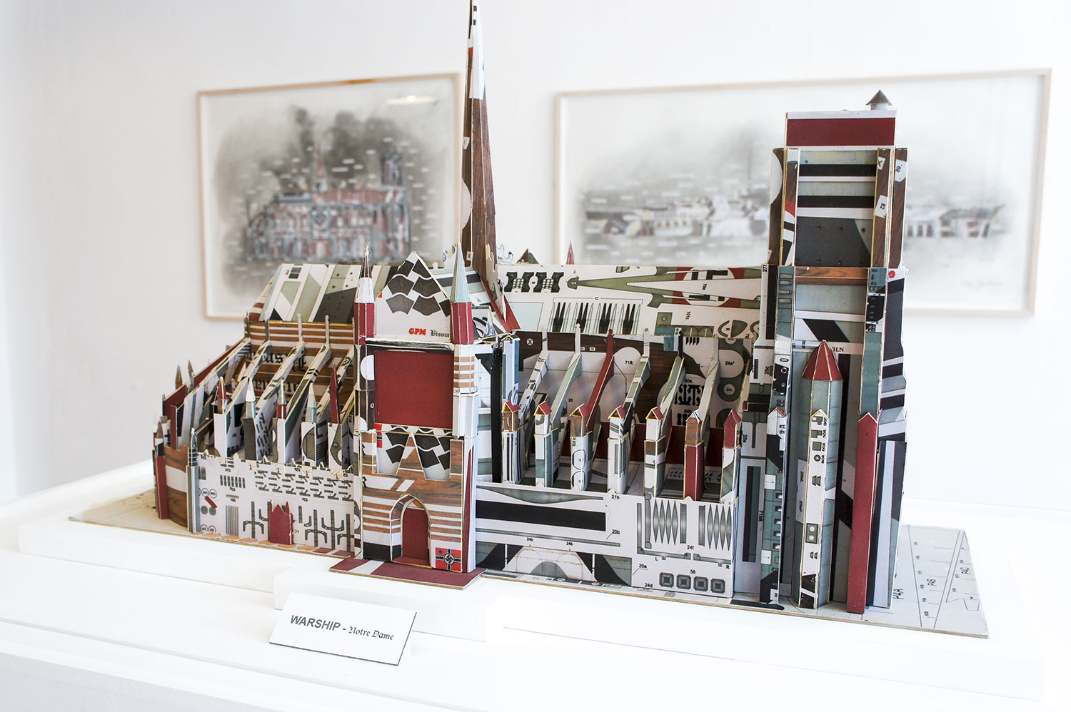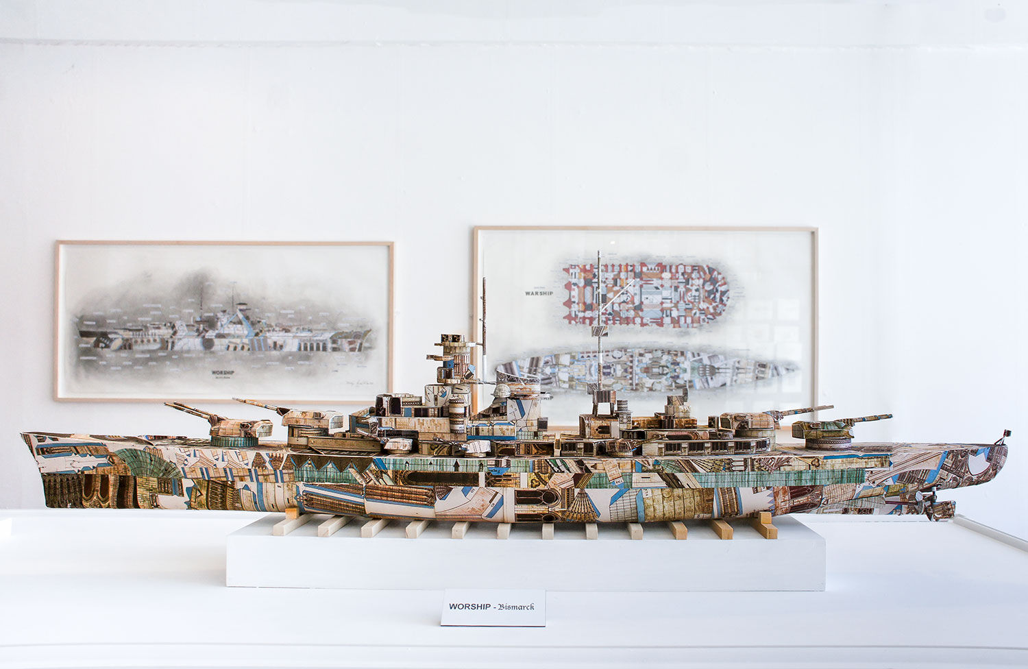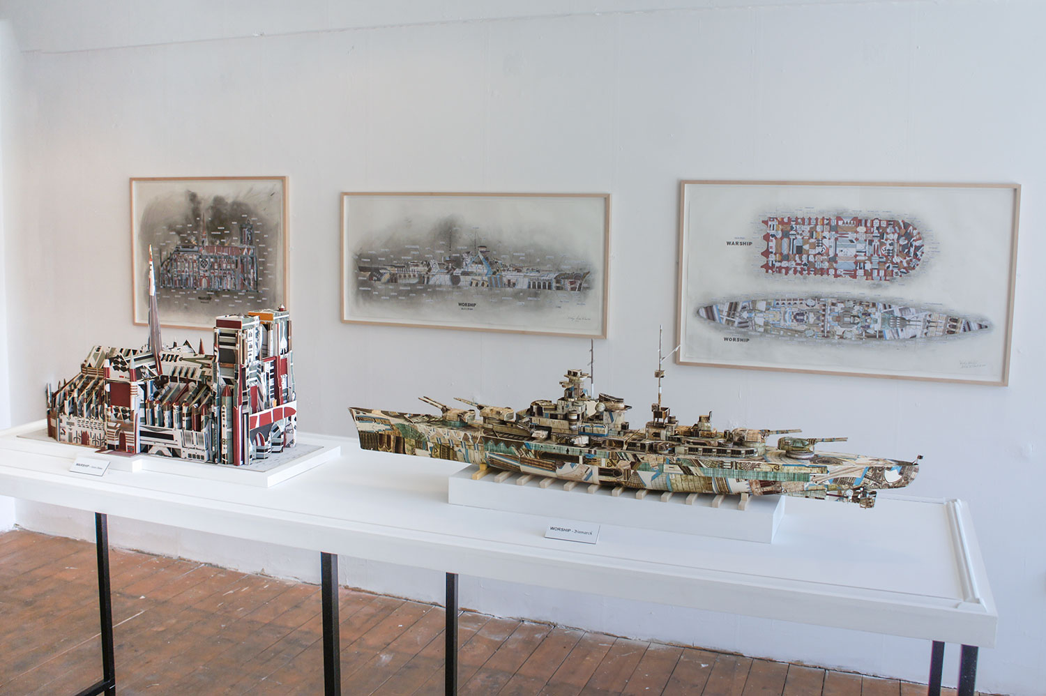 Warship–Worship comprises two large card models displayed within a cabinet: the German battleship Bismarck and the Parisian cathedral Notre Dame. The Bismarck is titled Worship, and Notre Dame is titled Warship, because each model is constructed using the printed imagery of the other.